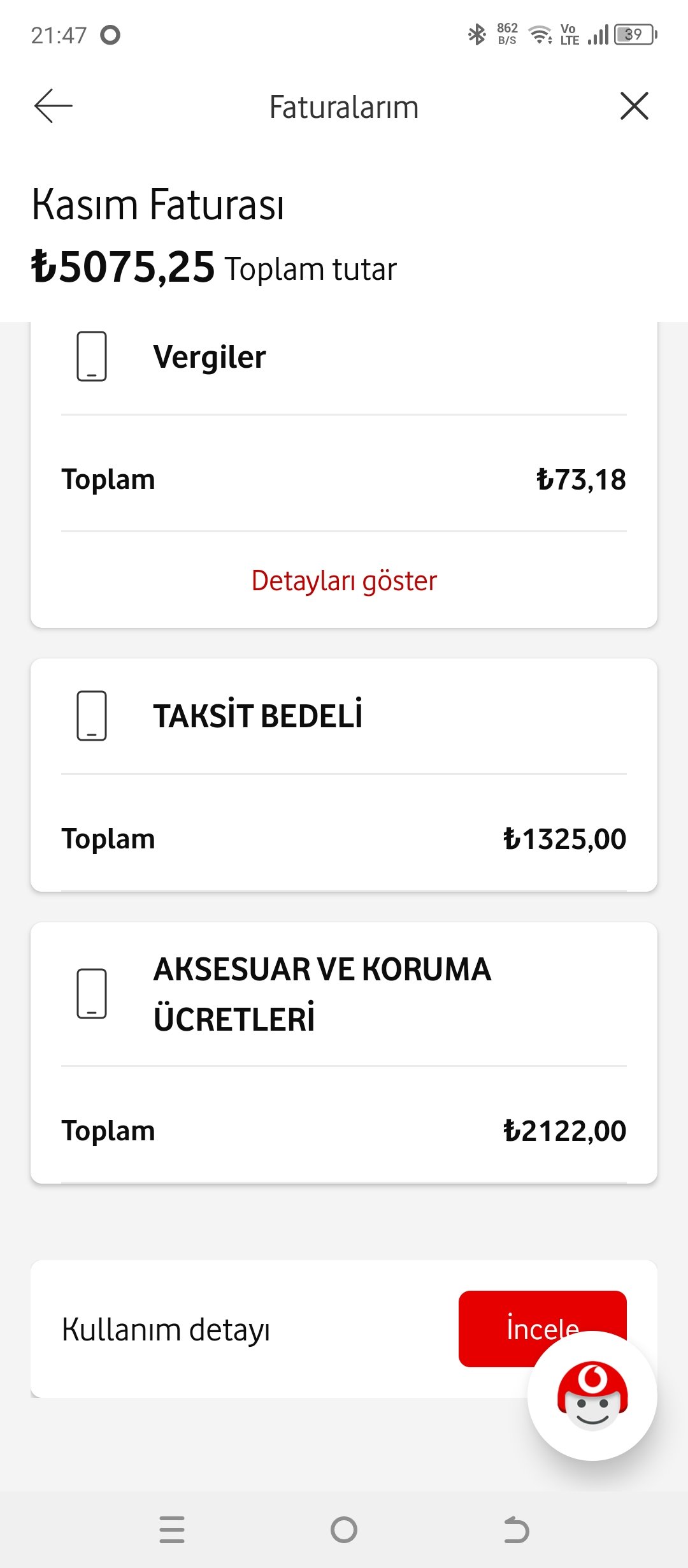 Yaklaşık 10 yıldır Vodafone abonesiyim ve genellikle faturama ek cihaz alarak kullanmaya devam ettim. Son olarak Aydın Kuşadası Alışveriş Merkezi’indeki Vodafone mağazasından Tecno Spark model bir cihaz aldım. Faturalarım her ay düzenli olarak 5.000 TL’nin üzerinde geliyordu ve bu duruma alışmıştım. Ancak, son taksit döneminde faturamı detaylıca incelediğimde, her ay “aksesuar ve koruma ücretleri” adı altında toplamda yaklaşık 45.000 TL’lik bir kasko ücreti tahsil edildiğini fark ettim. Ayrıca, cihazla birlikte bana bilgi verilmeden ekstra 1 GB internet paketi de tanımlanmış.